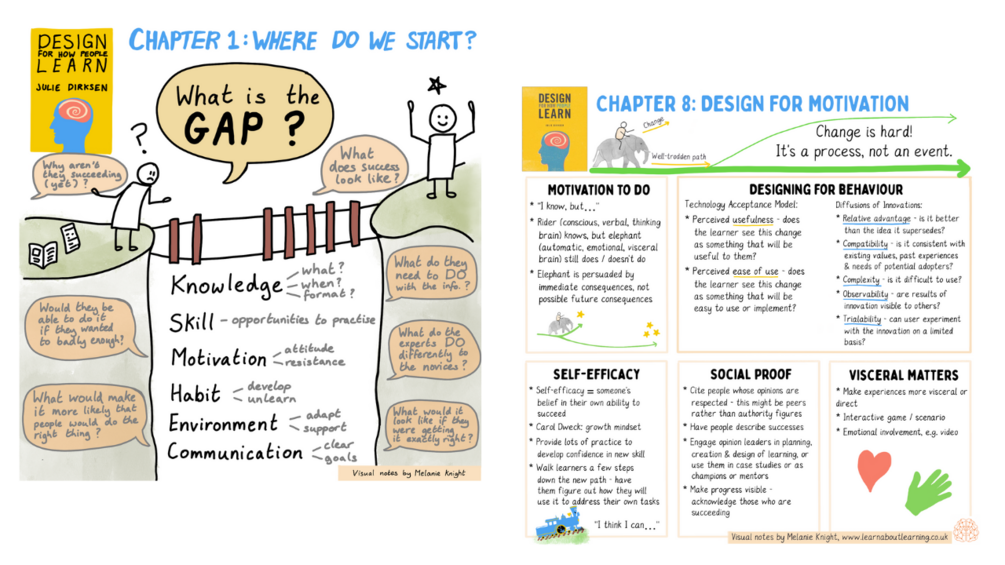 Visual summaries of each chapter of 'Design for How People Learn' by Julie Dirkson.