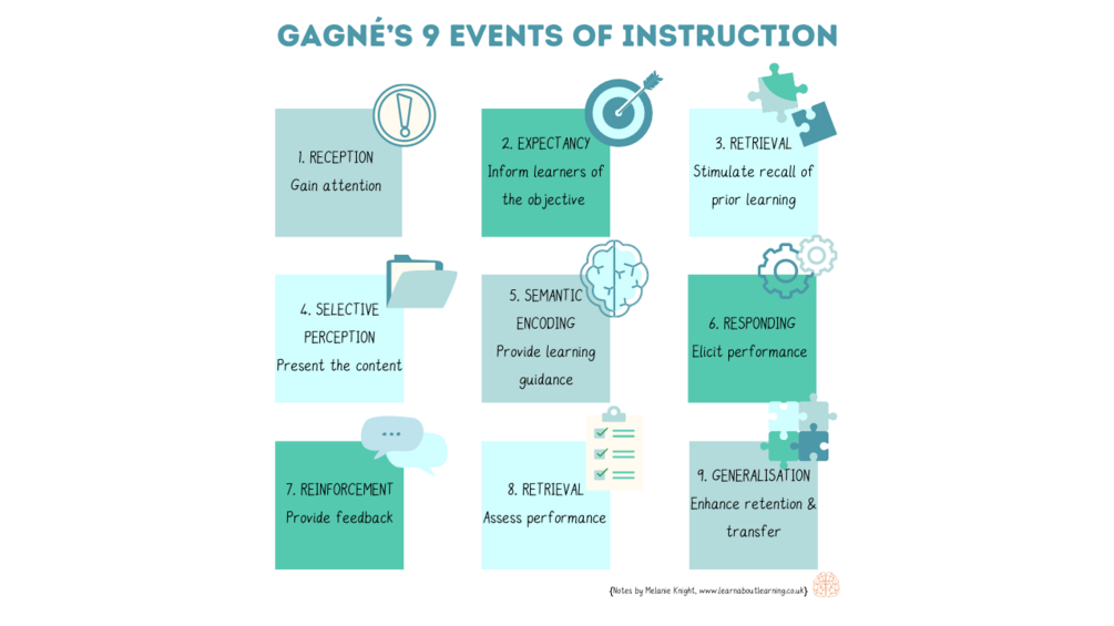 A visual summary of Gagne's 9 Events of Instruction. Large hi-resolution version to download and print.